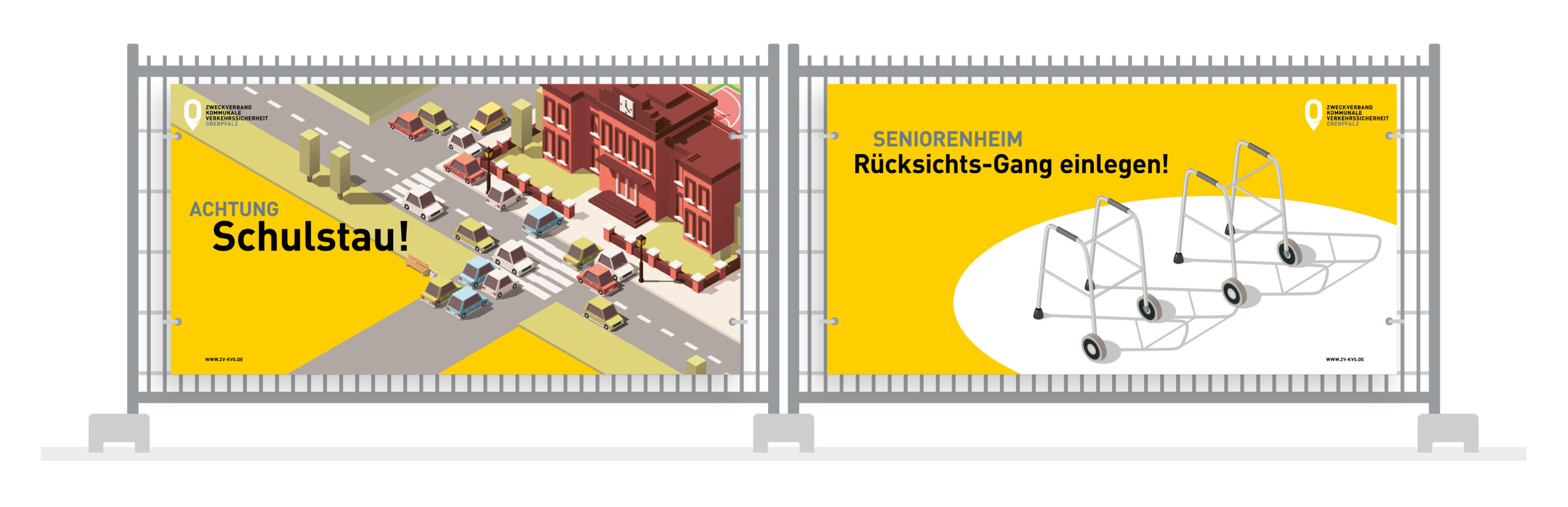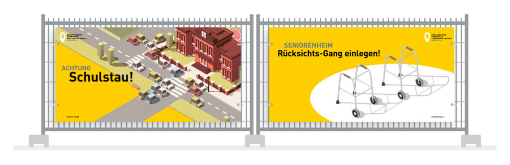 „Sei keine Rettungs-Barrikade!“, „Blitzer: Bitte lächeln!“ oder „Seniorenheim: Rücksichts-Gang einlegen!“ – unsere Banner und Bauzaun-Banner werden bereits in vielen unserer Kommunen sehr erfolgreich eingesetzt. In temporeduzierten Zonen wie beispielsweise vor Schulen, Kindergärten oder Pflegeheimen leisten sie einen wertvollen Beitrag, die Sicherheit im Straßenverkehr zu verbessern und die Position von Kindern und Senioren zu stärken.