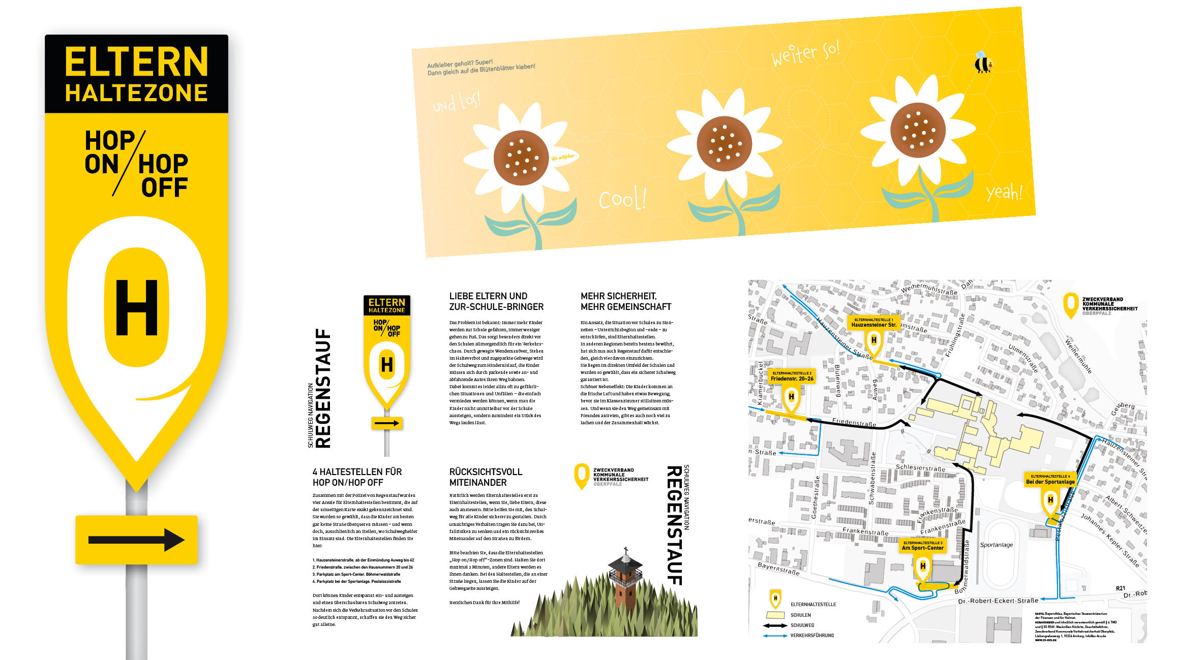 Um das Ganze für alle Beteiligten genau zu veranschaulichen, gestalten wir für jede Gemeinde mit Elternhaltestellen den Flyer „Schulweg Navigation“. Dieser bildet die „Hop on/Hop off“-Zonen und Laufwege der Kinder detailliert auf einer Karte ab – und beantwortet damit auch die Frage, wie die Kinder laufen sollten.
